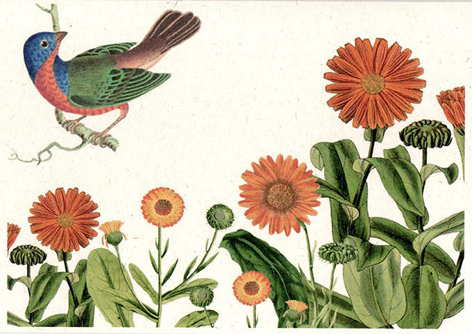 Back of the card reads: Marigolds, Calendula officinalis, plantportraitsbooks.com